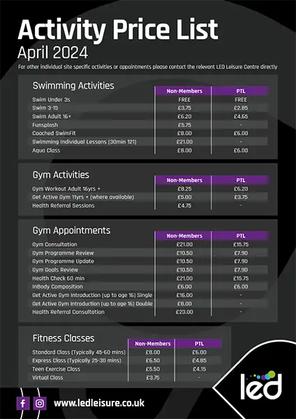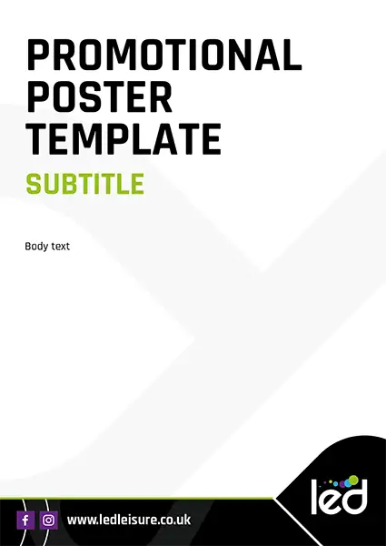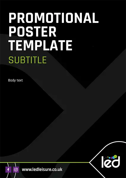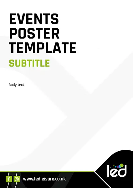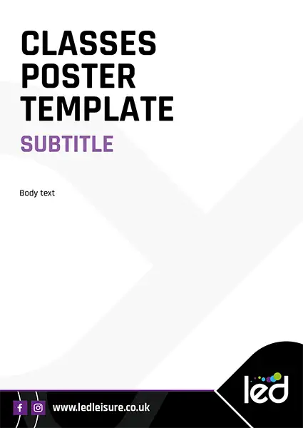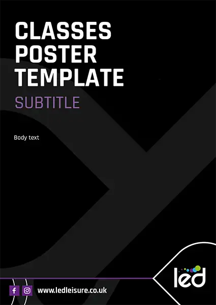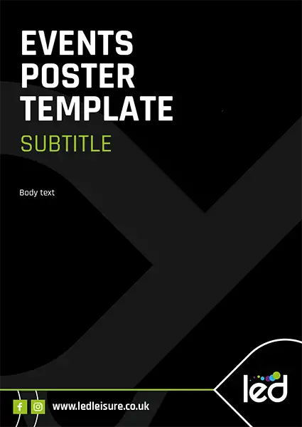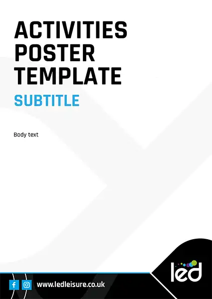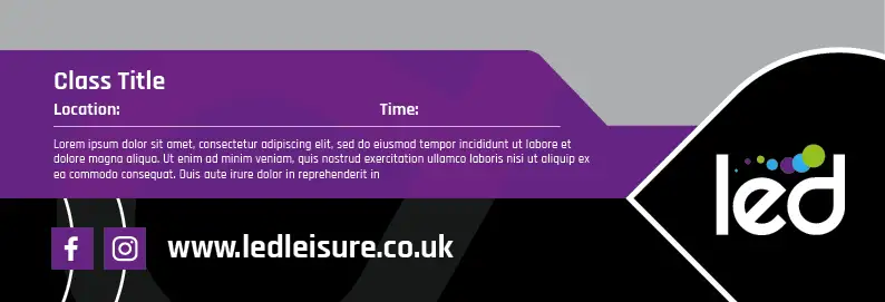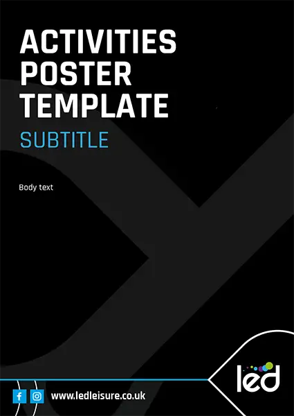 These templates use the LED – Community Leisure logo so would not be a centre specific poster. If your poster is centre specific, replace the LED – Community Leisure logo with the sub brand logo. See example here